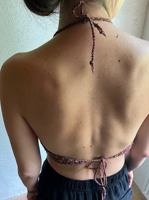 Knit seamlessly from the top down, this halter-style piece lets you enjoy an easy flow of stitches while the herringbone pattern does all the visual magic. The attached twisted cord straps add a playful, boho finish — perfect for layering or soaking up the sun.